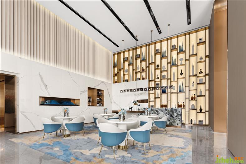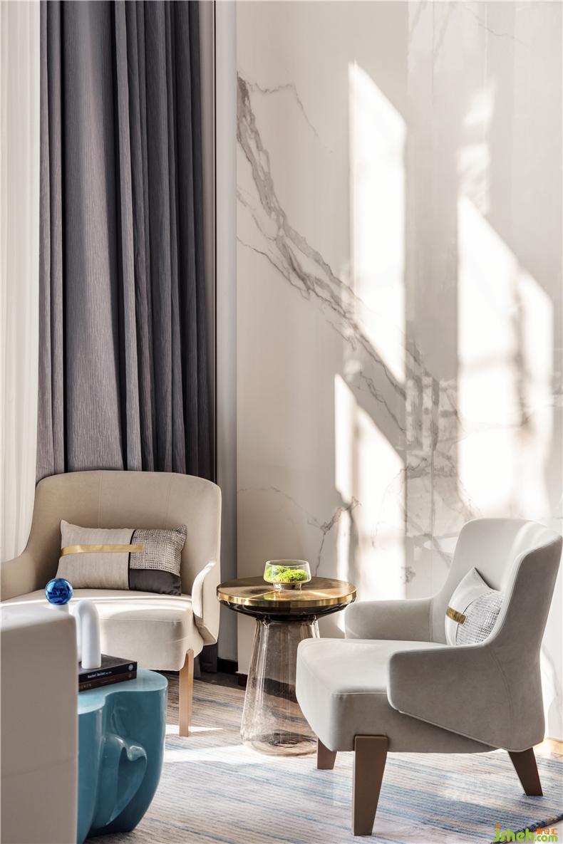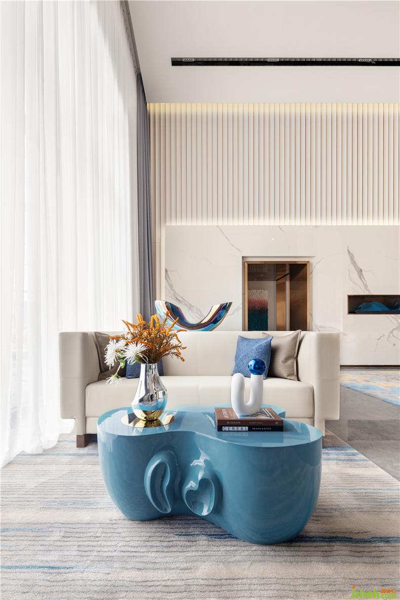 跟隨室內(nèi)層高,我們形塑出空間的體量感與連續(xù)性,白色大理石白和波紋板分割空間高低,售樓處設計打破沉悶的立面。水之藍的純凈則賦予空間靜謐安寧的氣質,當我們處在平靜自在的環(huán)境中,感官也自然地沉浸于此。