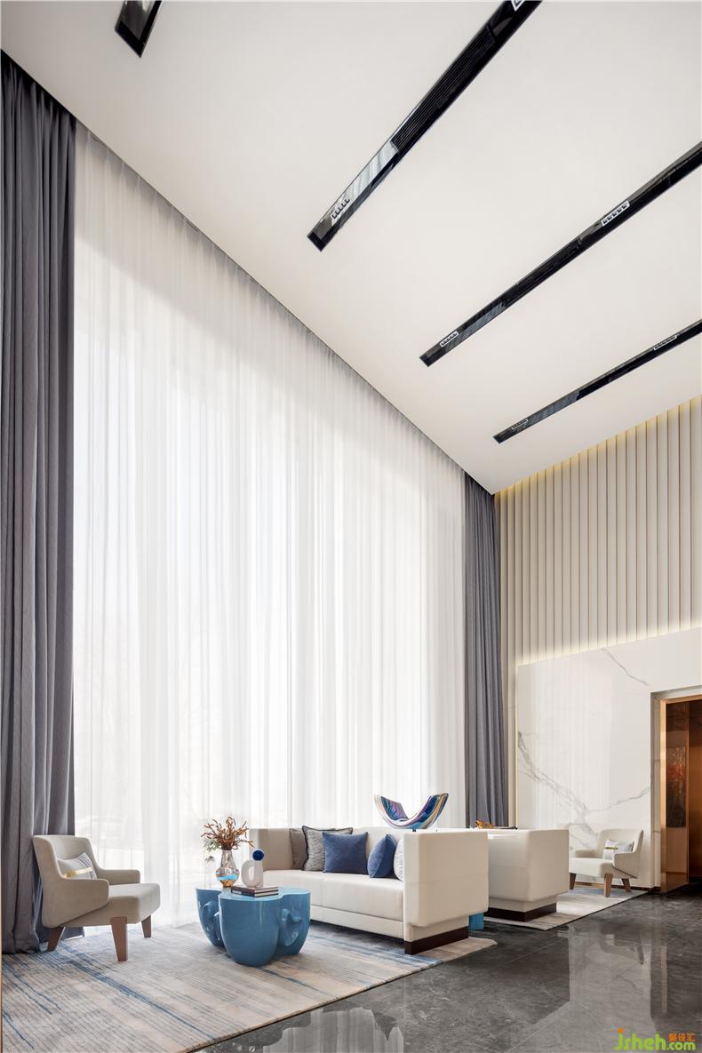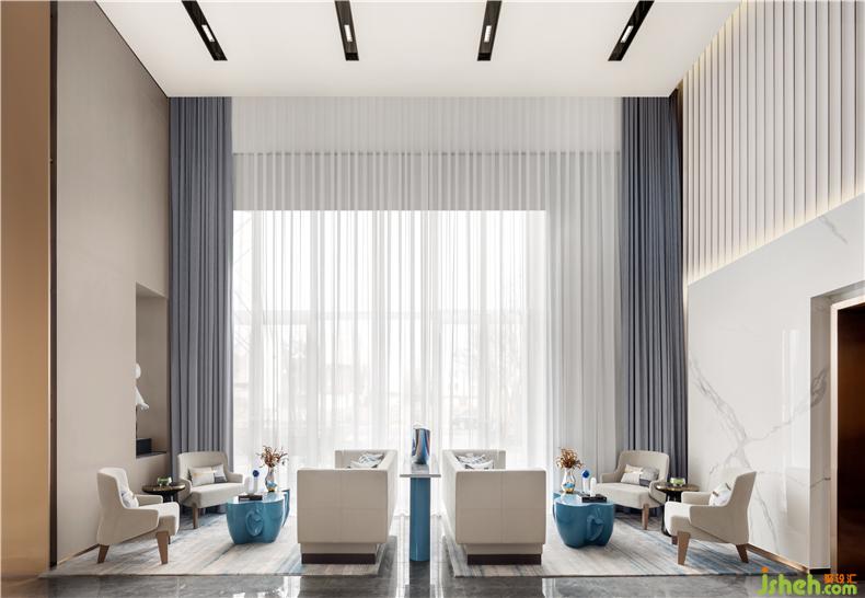 全落地窗構造出富有力量感的大挑高空間,與墻面淺灰色肌理相得益彰,售樓處設計帶來充分的透明感與開放感,人的感受也因此豐富起來。