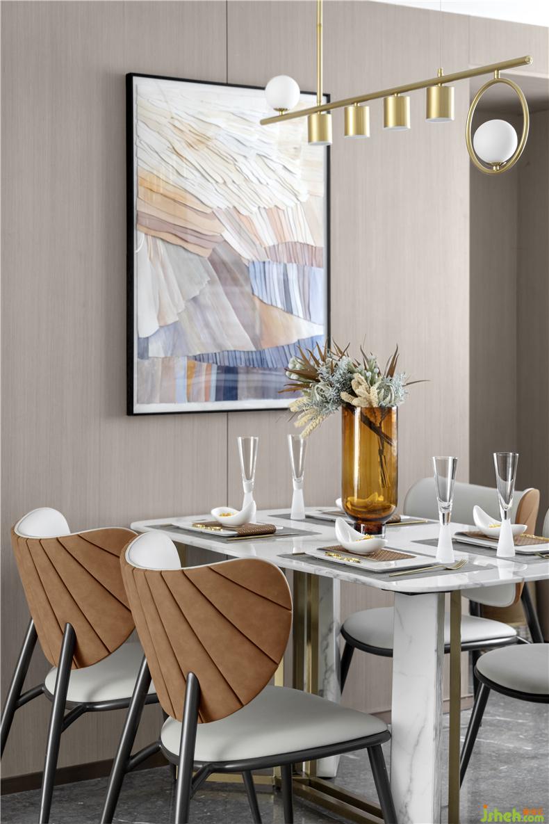 一草一木總關(guān)情,絢爛的花束讓進(jìn)食的片刻也得到美的陶冶。餐廳的軟裝選用了溫暖柔和的色系,與木飾面融合而獨(dú)立,向更輕盈、更自在的氣氛出發(fā)。