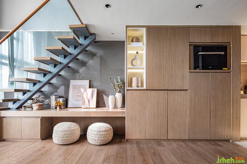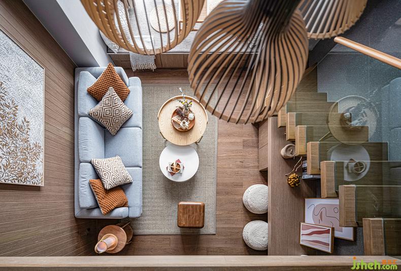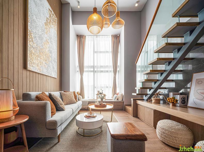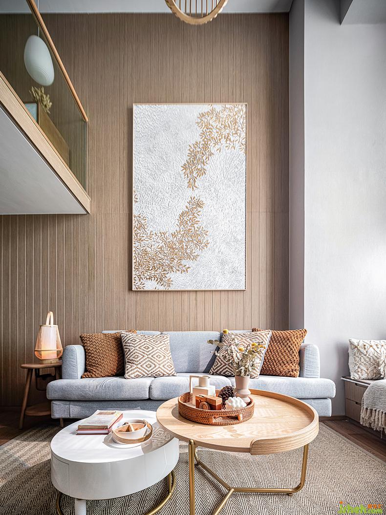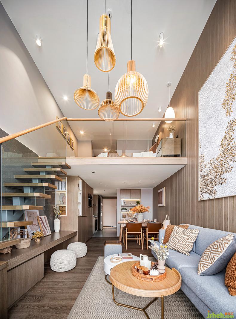 約4.5米的層高消除了空間的閉合感,木色沿著過(guò)道爬上地面和墻面,帶來(lái)秋天恬靜的氣息。樣板房設(shè)計(jì)籐編藝術(shù)吊燈與光的柔美結(jié)合,充分體現(xiàn)出自然材質(zhì)的美感
