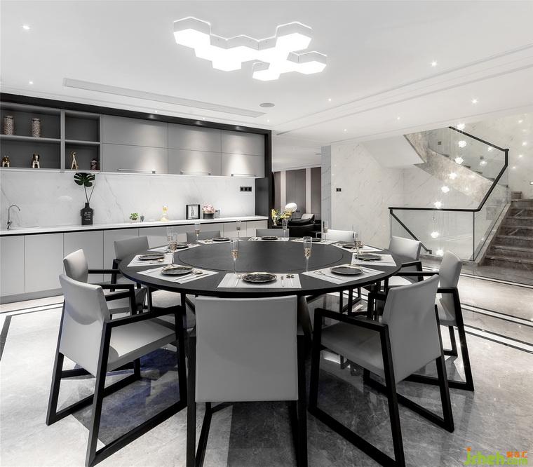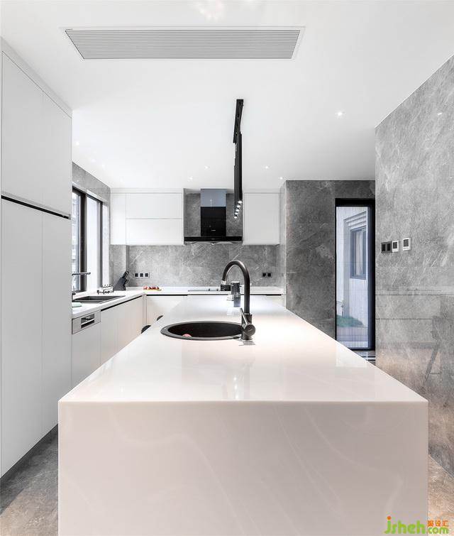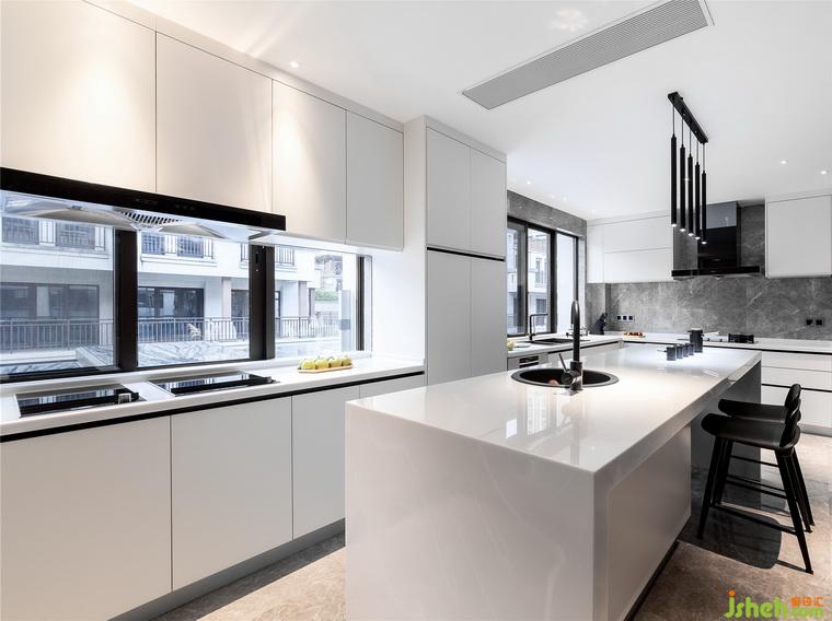 對(duì)于居家生活來(lái)講,理想中的廚房,一定是開放式,有島臺(tái),夠明亮,窗外不是菜園兩畝,就是一片海景。白色的櫥柜加上黑色線條的描邊,黑色的條形吊燈給空間增加了幾分的律動(dòng)。
