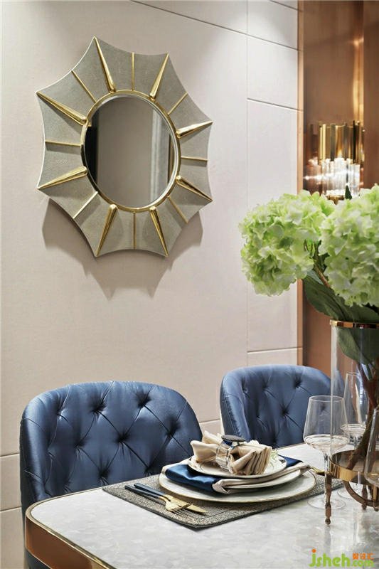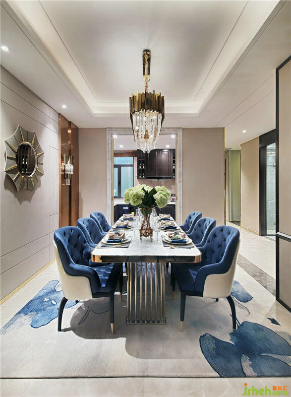 寶石藍(lán)的絲絨座椅色澤低調(diào)內(nèi)斂,造型古典而華美,設(shè)計(jì)線條柔和精致,弧線形的椅腿與直線型的餐桌支架相呼應(yīng),潔白細(xì)膩的餐廳桌面映襯淡雅的藍(lán)花地毯,餐廳空間奢華的風(fēng)格之中又巧妙添加一絲清新,相得益彰。