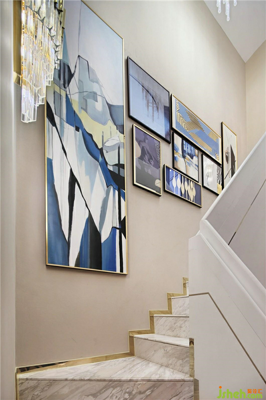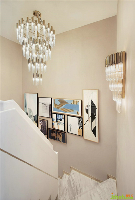 樓梯的照明采用吊燈與壁燈的組合光源,多層次多方位的光線讓樓梯的照明沒(méi)有一絲死角,溫和明亮的光線點(diǎn)亮樓道的每一個(gè)角落。金屬底座與水晶燈飾的搭配更增添了光線的朦朧之態(tài),圣潔而華美。
