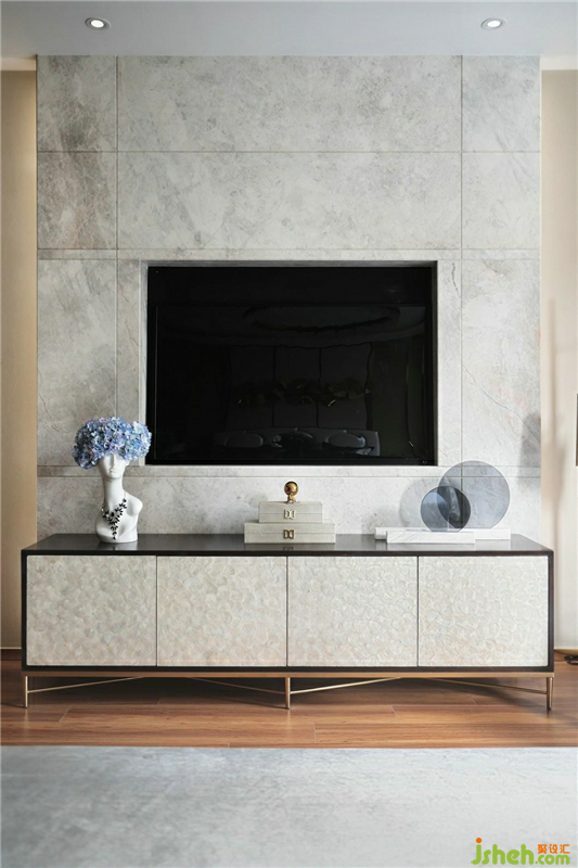 主臥的電視背景墻與客廳的電視背景墻采用了相似的設(shè)計,二者遙相呼應(yīng),細(xì)膩的瓷磚質(zhì)感搭配粗獷的石紋圖樣,映襯著木紋地板與灰色的毛絨地毯的搭配,對比的沖突極富張力。