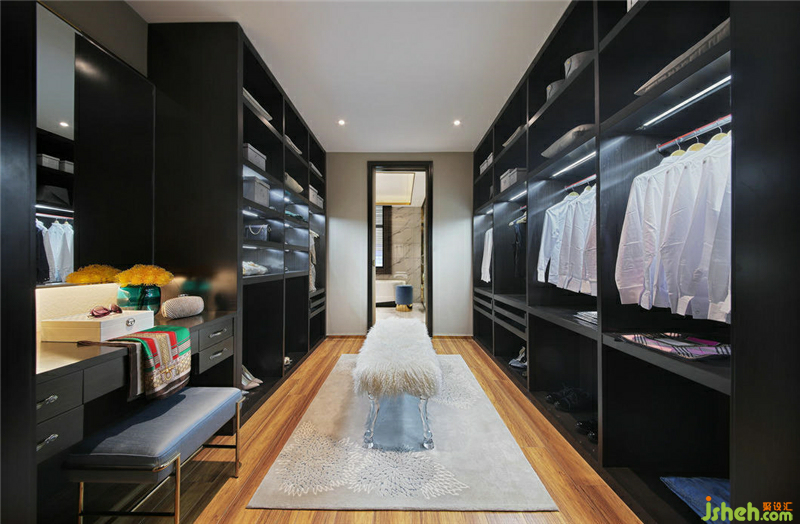衣帽間黑白色調(diào)的強(qiáng)烈對比讓空間富有視覺層次感。潔白的墻面干凈整潔,頂上的內(nèi)嵌點(diǎn)射式光源讓室內(nèi)充斥著柔和的燈光,打造出一個溫和舒適的私人空間。