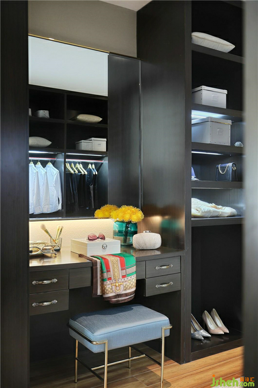梳妝臺上的大大玻璃鏡讓主人可以全方位映照出自己的身影,臺上的黃色小雛菊為整個衣帽間增添了一絲自然的氣息。