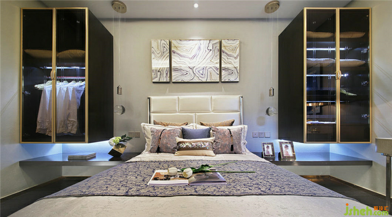 衣櫥采用壁掛的形式,為臥室節(jié)省了部分空間,設(shè)計精致。玻璃材質(zhì)的壁櫥更顯通透,讓衣柜看起來更有光澤度、更時尚,它融合時尚的現(xiàn)代類型和傳統(tǒng)裝飾,象征著主人的生活品味。