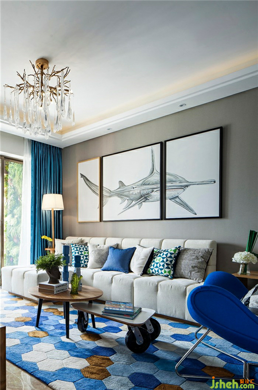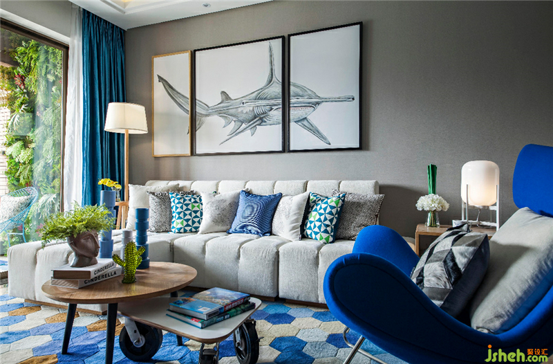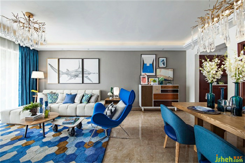用海洋藍和米白色為主基調(diào),加以原木色配淺灰色裝飾著整個空間。簡潔帶肌理的壁紙,讓空間展現(xiàn)出海洋藍的魄力和對大自然向往的自由。清新的色彩搭配,不帶雕花、紋飾的家具,簡潔具功能化更貼近自然。從紋理到顏色都給人一種舒適的人情味,北歐現(xiàn)代的記憶仿佛真實的印刻在每塊木板上面。室內(nèi)設(shè)計師
