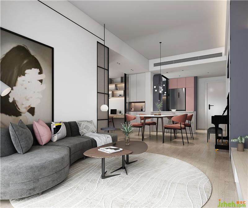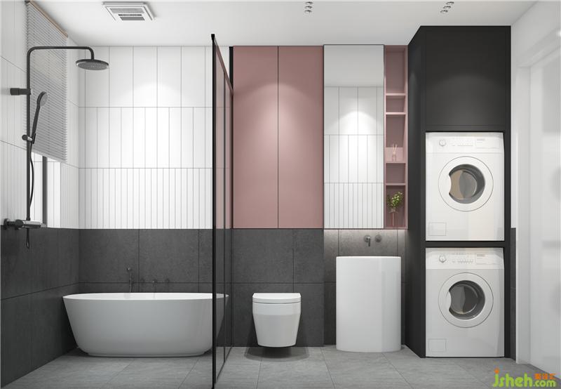 衛(wèi)生間也延續(xù)了空間的色彩基調(diào),黑白灰的搭配,再以粉色浴室柜做點(diǎn)綴。而墻面的白色墻磚做了細(xì)節(jié)設(shè)計(jì),由小片到大片的拼接,衛(wèi)生間也可以有精致感。室內(nèi)設(shè)計(jì)師