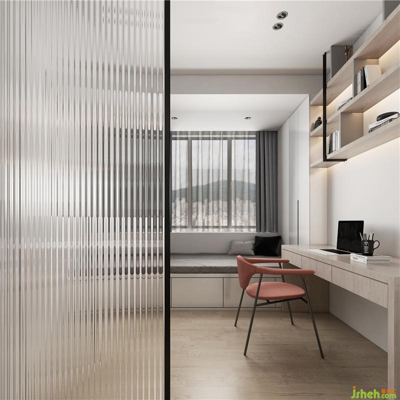 書房兼具客房的功能,足夠長的辦公桌,滿足兩個(gè)人同時(shí)辦公的需求,書架做成開放式,以黑色隔板隔開,錯(cuò)落有致。室內(nèi)設(shè)計(jì)師