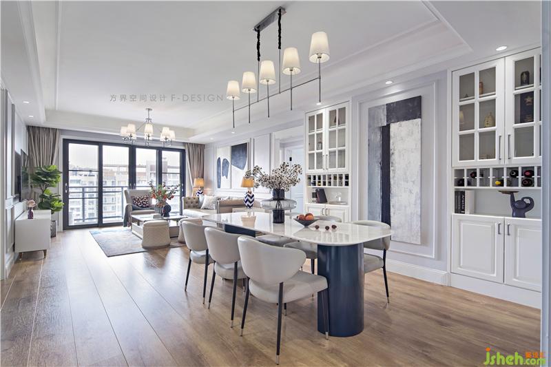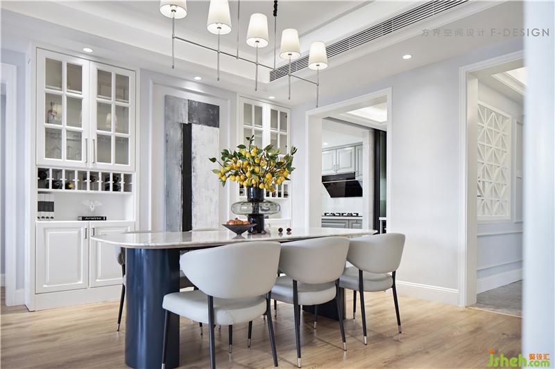 光影交錯(cuò)的掛件豐富了空間層次,并與銀色餐燈相呼應(yīng)。大理石臺(tái)面的餐桌為空間注入現(xiàn)代氣息,現(xiàn)代與美式的結(jié)合,家具的選擇更有包容性。