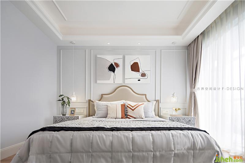 沿用空間主體色調(diào),把紅色作為點(diǎn)綴色,為空間增添有彩色。床頭柜黑與白的碰撞,圖案元素的重復(fù)組合,繁而不雜。綠植的擺放恰如其分,為空間帶來(lái)生氣。