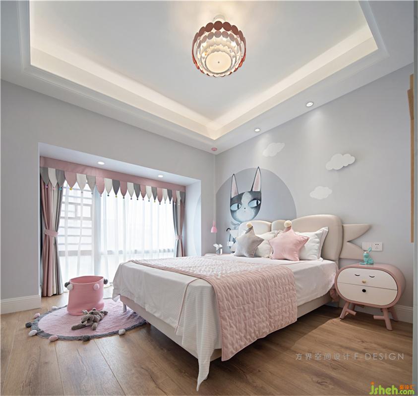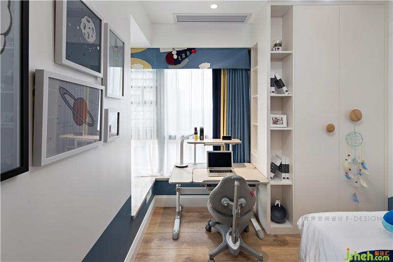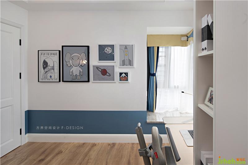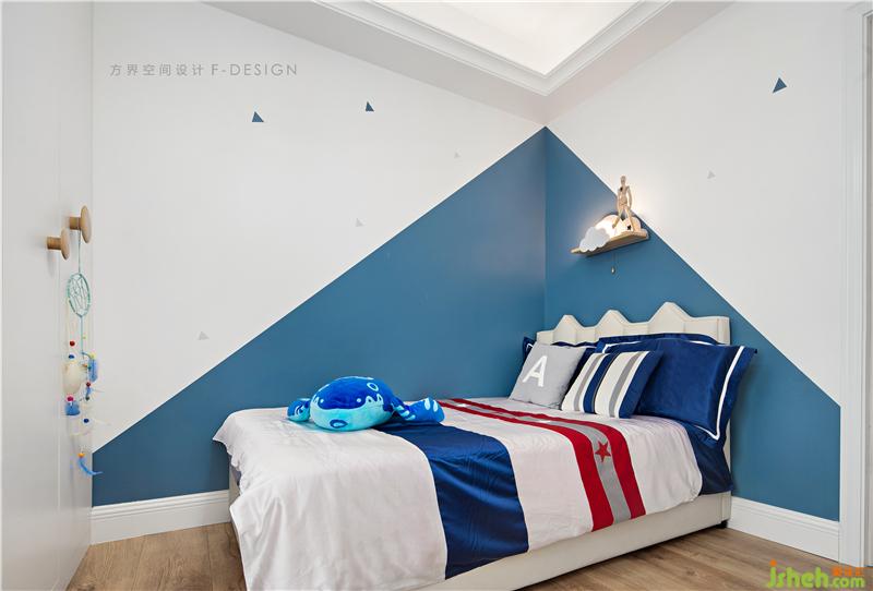 “鯨魚寶貝是媽媽在我剛出生的時(shí)候買給我的”,男孩跟我們開(kāi)心的分享。男孩房選用藍(lán)色作為主題色,藍(lán)色是大海的顏色,純凈,寬闊。男孩房沒(méi)有做太多的裝飾,墻面只是簡(jiǎn)單的幾何拼色,只有最單純的顏色才能喚起最強(qiáng)烈的心靈感受。