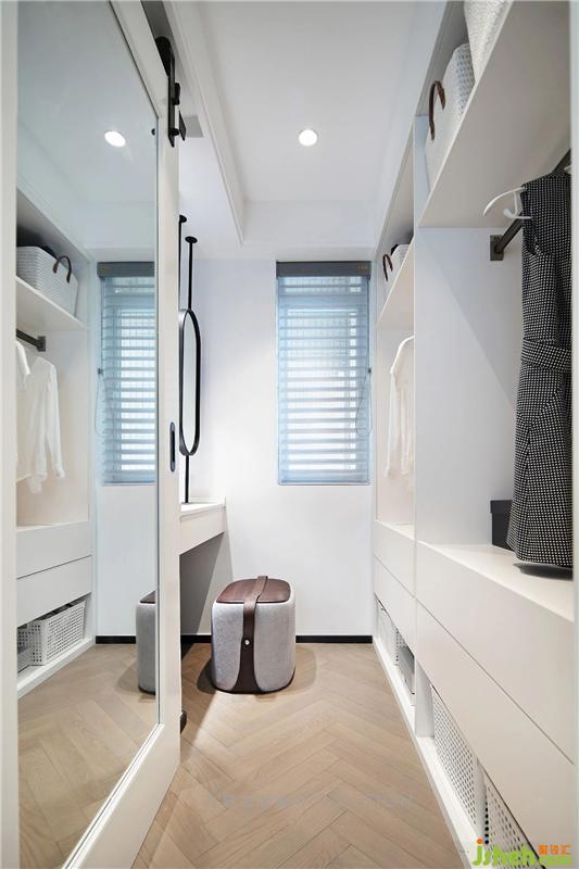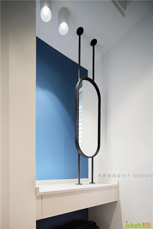 左側的谷倉門左移后就是過到衛(wèi)生間的空間,我們在這里做了個套間的功能,可開可合的空間里有多種可能性衣帽間必備一個梳妝區(qū)域,梳妝臺搭配個性實用鏡子,看似簡單卻極具品味,空間雖小卻也不擁擠,暖色調(diào)的光線提升衣帽間格調(diào)。
