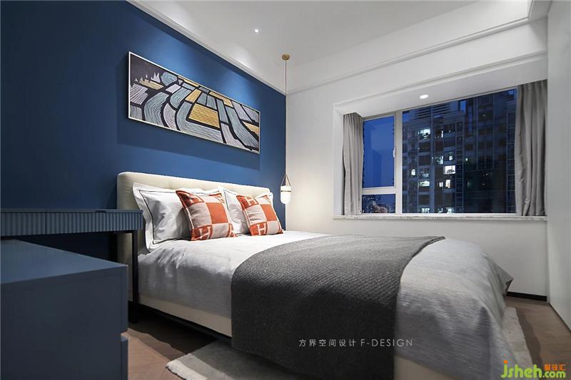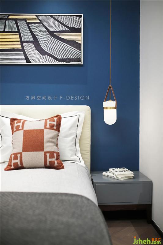 床頭一側吊溫馨小吊燈,增加氛圍光。房間沒有太多的裝飾物,采用極簡的配色,追求空間寬敝,而以藍色為床頭背景墻顏色作為點綴,活躍了空間,空空的墻面,搭配掛畫,在極簡中生出樂趣。
