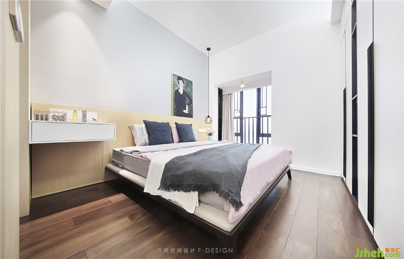 背景墻由灰色墻漆與木色護墻板構(gòu)成,空間整體簡約,無過多繁復(fù)。粉與灰的撞色,別具一格,床頭小吊燈與裝飾畫添上幾筆藝術(shù)氣息,簡約而不簡單,空間氛圍層層遞進。室內(nèi)設(shè)計師