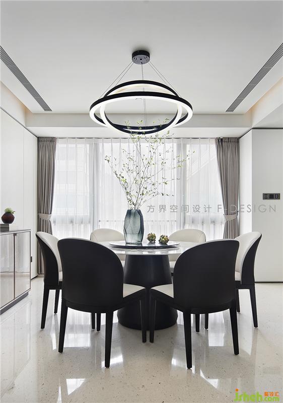餐廳是家人們團聚交流情感的地方,一張大圓桌把家人聚集到一起,餐椅舒適精致而優(yōu)雅,家的格調(diào)就蘊藏在不經(jīng)意的細節(jié)中。餐桌頂部設(shè)有吊燈,餐桌的綠植點點綠色隱沒在白色之間,帶來自然、舒適的氛圍感。