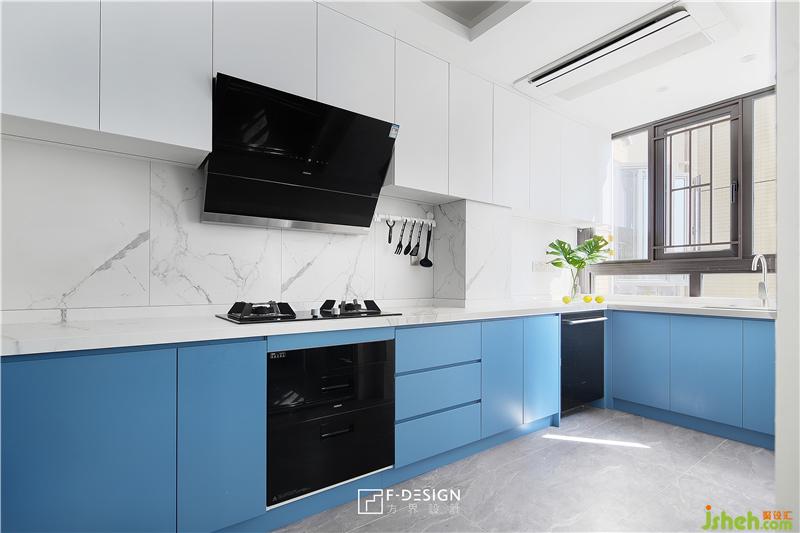 廚房空間增添了業(yè)主喜歡的藍(lán)色基調(diào),廚房的功能區(qū)分布也很清晰明確,L型櫥柜,物品收納井然整潔有序。