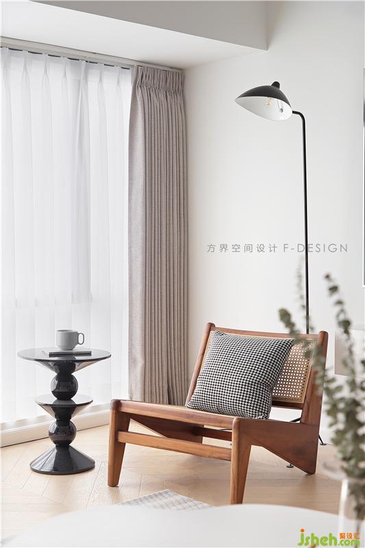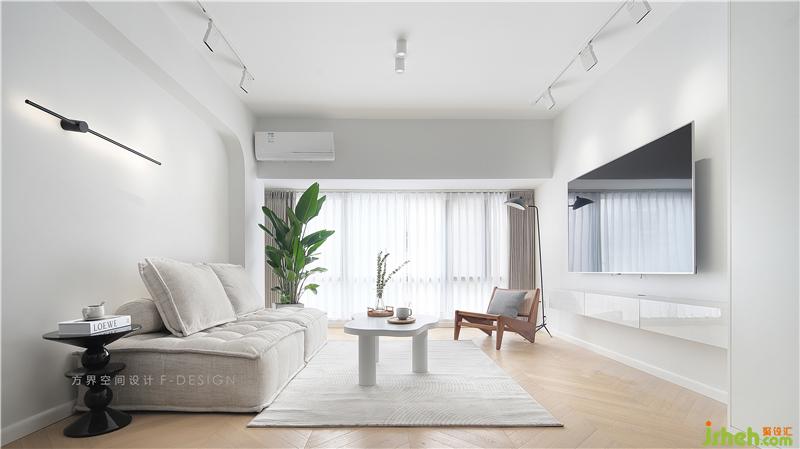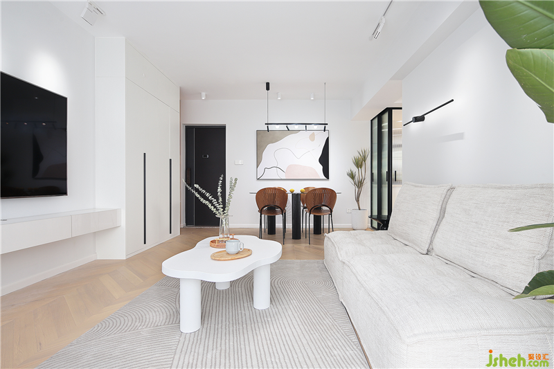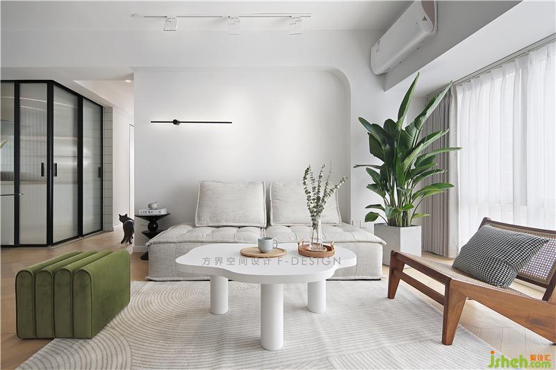 整個空間都是呈現(xiàn)出簡約的狀態(tài),木色作為地面基色搭配素白的色調(diào),綠色作為跳躍色,剛好拼湊在這個空間里。在設計上,沙發(fā)背景墻設計了一個有弧度的造型,提升線條美感,放眼望去,會比直角更加柔和。