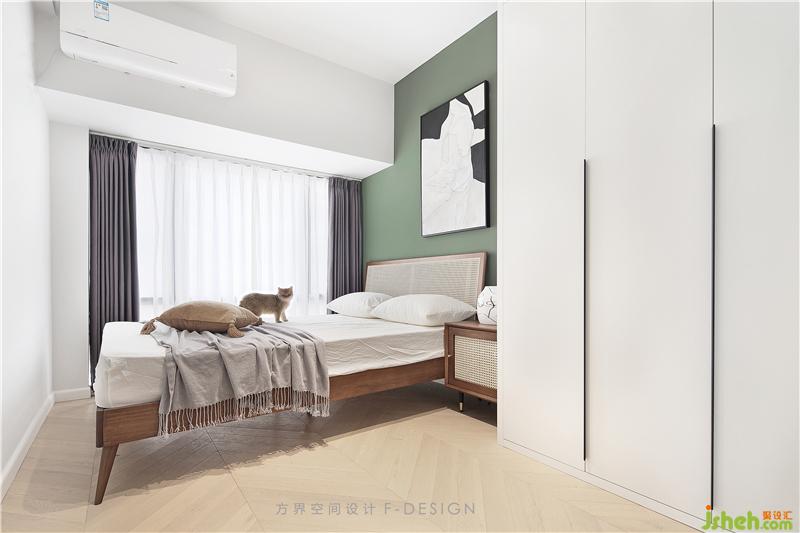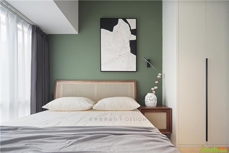 復古的墨綠色床頭背景墻與藤質(zhì)的床頭靠背、白色的衣柜,彰顯出的文藝與沉靜。通過掛畫、軟裝、整體搭配出舒適溫馨的睡眠環(huán)境。