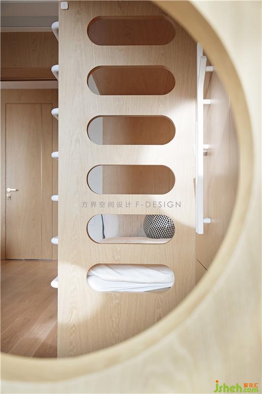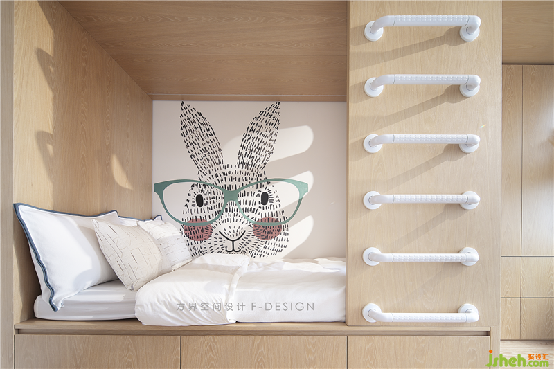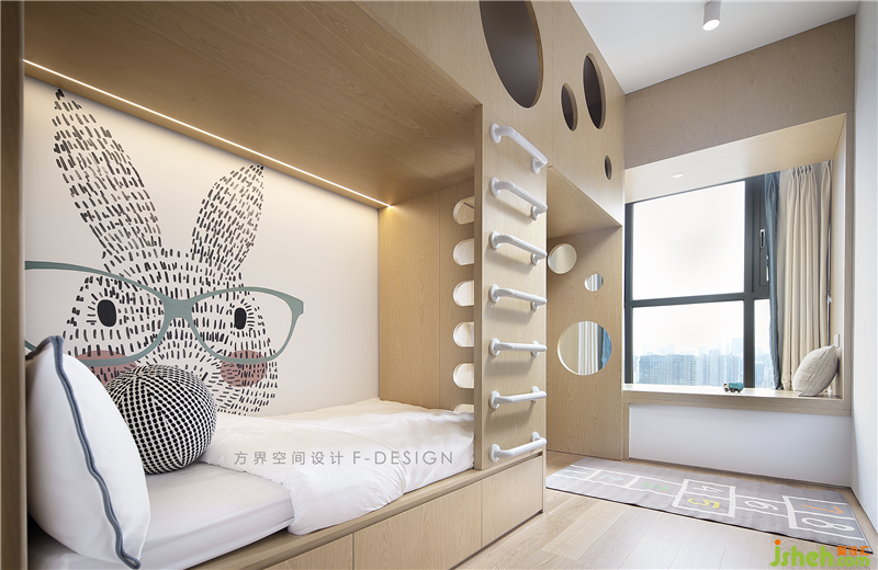 兒童房整個空間以童趣設(shè)計為主,采用上下鋪形式,留出一部分空間作為攀爬玩樂區(qū),布局緊湊合理,休憩娛樂兩不誤。背景墻卡通動物顯得趣意盎然,簡簡單單,給于孩子充滿一個純凈天真的空間。