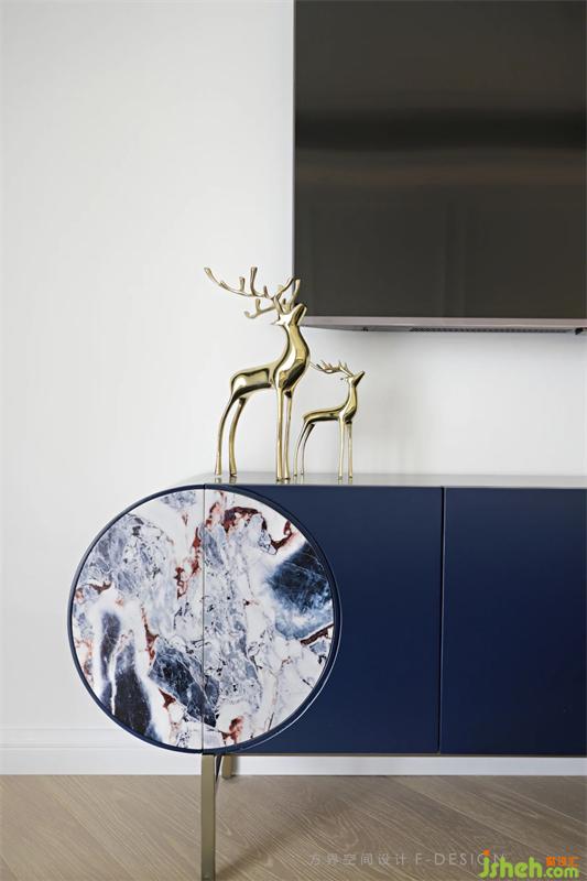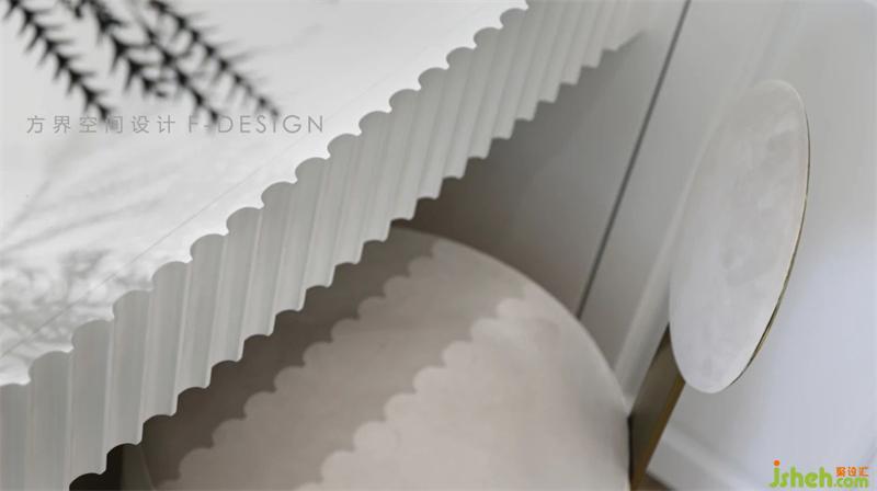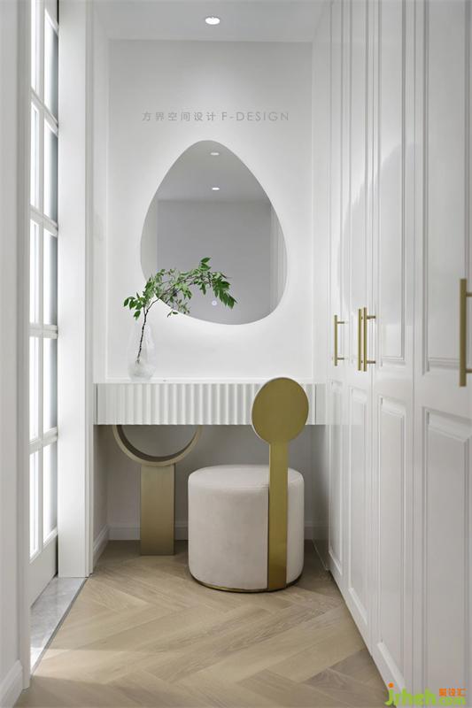 柜子采用白色烤漆板,搭配金屬拉手,讓整個空間的視野更加開闊,明亮。梳妝臺上方用的是異形智能梳妝鏡,打開開關(guān),光線可以柔和空間。