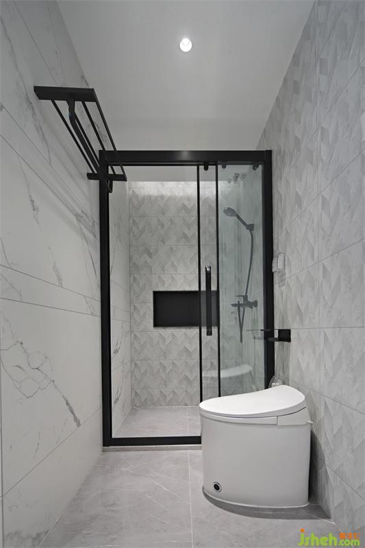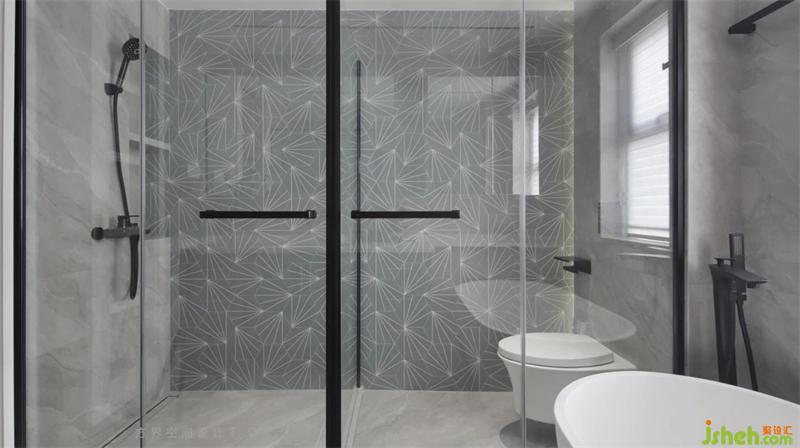 淋浴空間因為沒有光線,墻面的瓷磚是洗手臺延伸過來的,淋浴里面嵌入了金屬柜子,方便放沐浴露。墻面的的瓷磚也有變化,不是通鋪的白色,而是精挑細(xì)選的幾何磚。