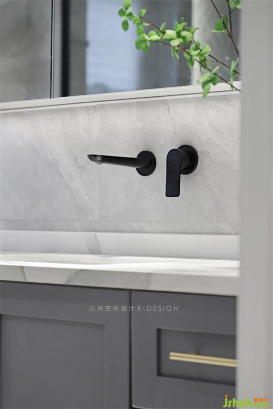 洗手臺的龍頭采用墻出龍頭,整體設(shè)計會更加干凈,美觀。黑色的龍頭和淋浴隔斷呼應(yīng)。