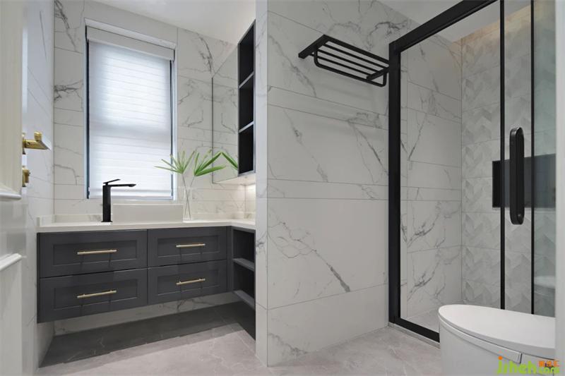 簡約的白色搭配了黑色的邊,最經(jīng)典的黑白色系打造了浴室的大方簡約與純粹。