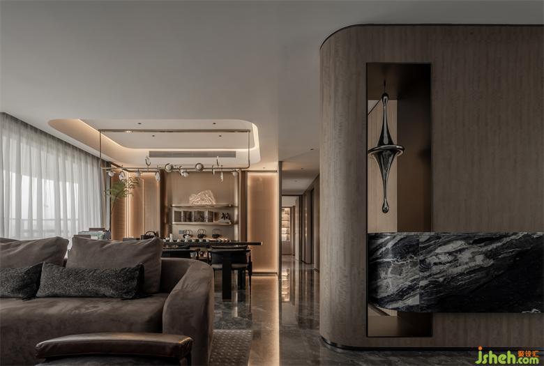 室內(nèi)連續(xù)的深色木作一改厚重的姿態(tài),似輕盈般鋪陳開來。明與暗,深與淺、柔軟與粗放構(gòu)成生活區(qū)靈動的形式語言。