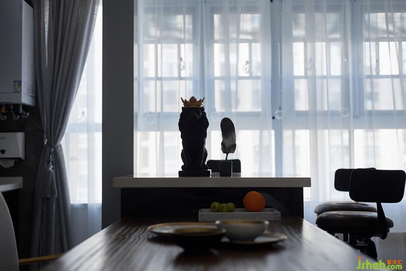 為了讓餐廳和客廳有連貫性,將餐廳的一面墻用實(shí)用的柜體和水泥灰磚墻融為一體,延伸到客廳區(qū)域,使餐廳、客廳相互呼應(yīng)。