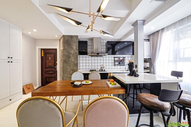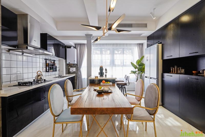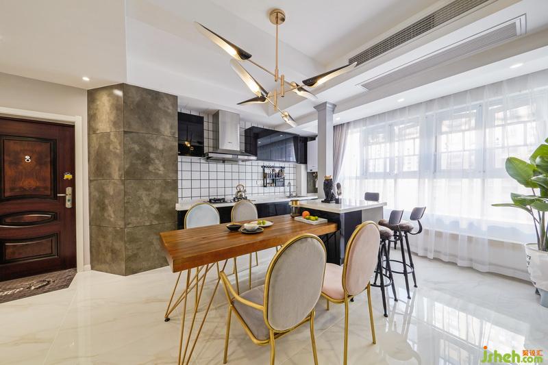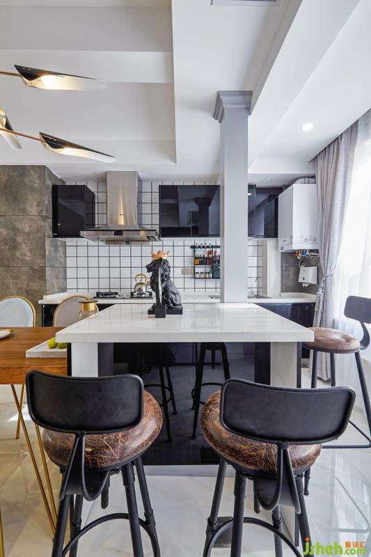 入戶的左邊原戶型是廚房餐廳和小陽臺,為了餐廳廚房區(qū)域更開闊,就把它們?nèi)跒橐惑w,開放式的廚房和餐廳,入戶后會感覺到開闊的視覺空間。
