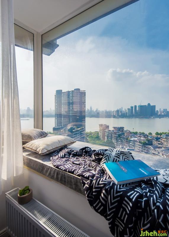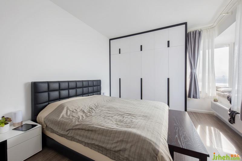 臥室采用黑色家具以及黑白配色的衣柜與整體相呼應(yīng),飄窗采用布藝的軟包更加舒適,透過(guò)舒適的飄窗觀看江景更有一番風(fēng)味。在舒適的休息日中,拿本自己喜愛(ài)的書(shū),享受一個(gè)屬于自己的下午。