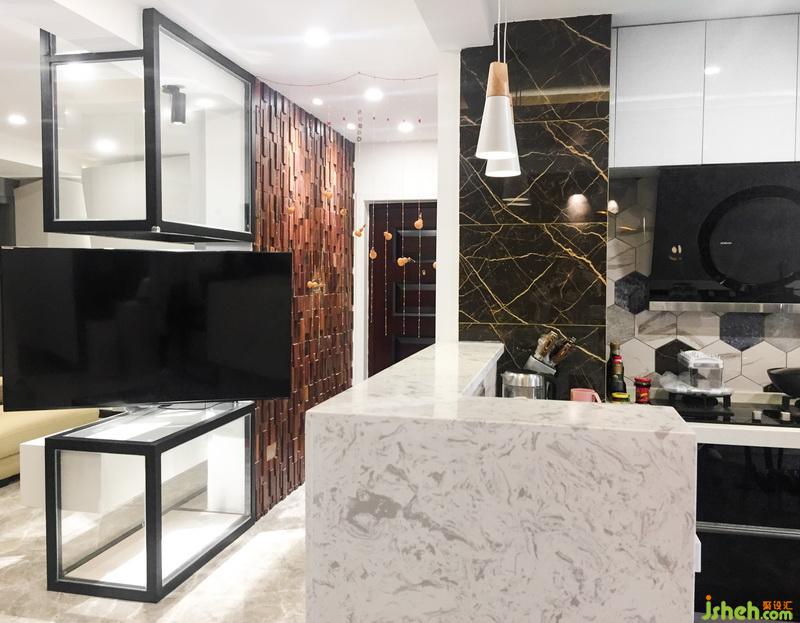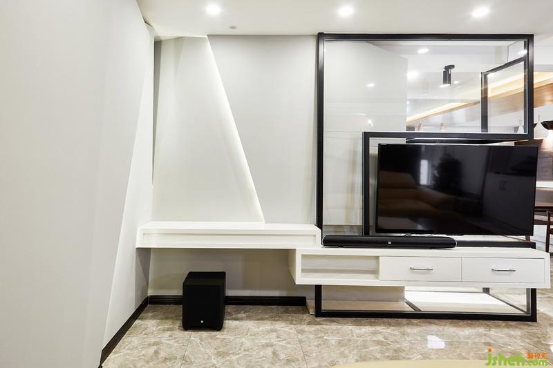 懸浮式的電視柜從背景造型延伸到電視區(qū)域,黑色鋼材質(zhì)的邊框與電視機(jī)渾然一體。電視機(jī)的區(qū)域安排在客廳與餐廳中間是因?yàn)椋瑯I(yè)主的職業(yè)經(jīng)常需要在餐桌上構(gòu)圖,這樣辦公的時(shí)候也能將電視轉(zhuǎn)向餐廳方向使用。