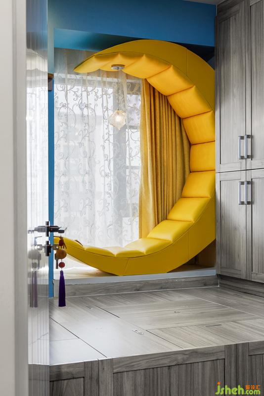 次臥為兒童房,榻榻米區(qū)域是為了以后家里父母來了可以睡覺,飄窗上的月亮是為了以后小朋友可以坐在上面看書,月亮的中間還有一個(gè)小吊燈可以在看書的時(shí)候使用。