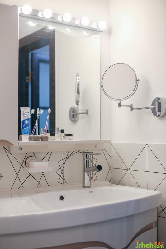 在洗手臺區(qū)域,我們除了安裝浴室鏡,還貼心地裝上了可供360°旋轉(zhuǎn)的化妝鏡,鏡子前設(shè)置了一排鏡前燈。充足的光照,讓女主人化妝變得極其方便。每天出門都能漂漂亮亮噠~