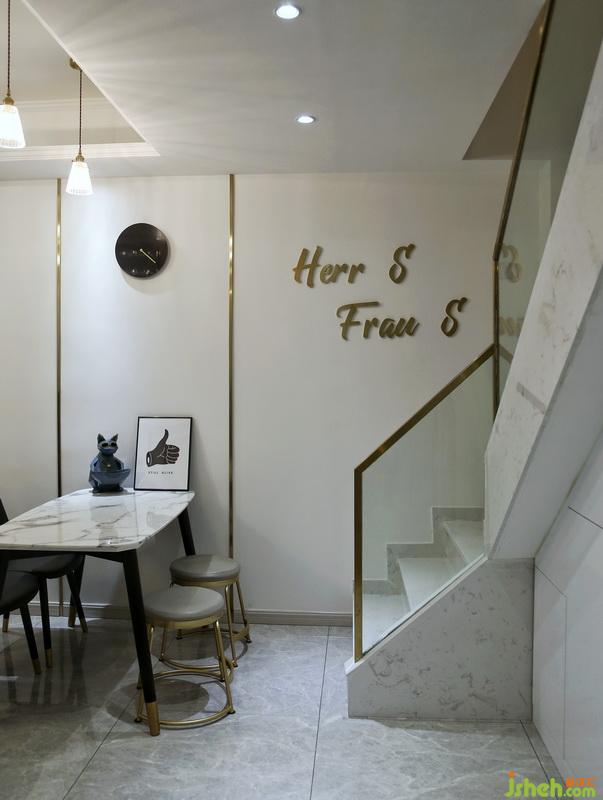 作為一樓到二樓的過渡地段,設(shè)計(jì)師用金色的扶手來裝飾,加入大型的植物墻紙,形成了一條美輪美奐的金色道路