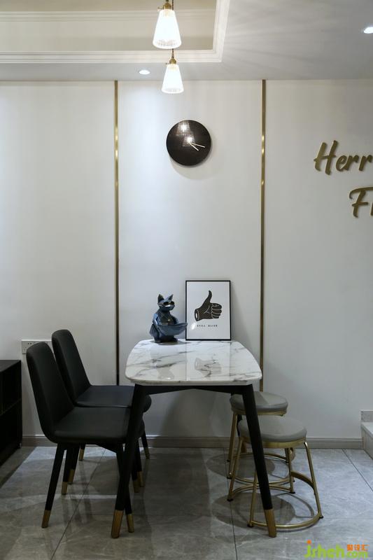 金屬線條流暢寫意,鋪貼于墻面,極具高級(jí)感,流水紋理般的煙灰色瓷磚,從客廳貫穿到餐廳,氣質(zhì)范兒十足