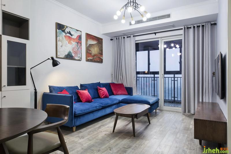 進(jìn)入客廳后,藍(lán)紅交織的空間即刻映入眼中??兹杆{(lán)的絲絨沙發(fā),是在方案最初就確定下來的“必入品”,配上紅色絲絨抱枕,形成大膽的紅藍(lán)撞色。這是家給人的第一印象:時(shí)髦。