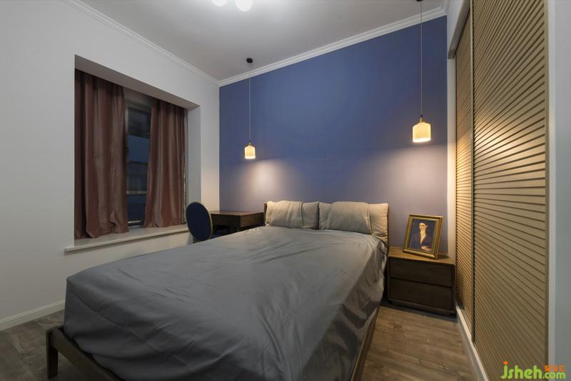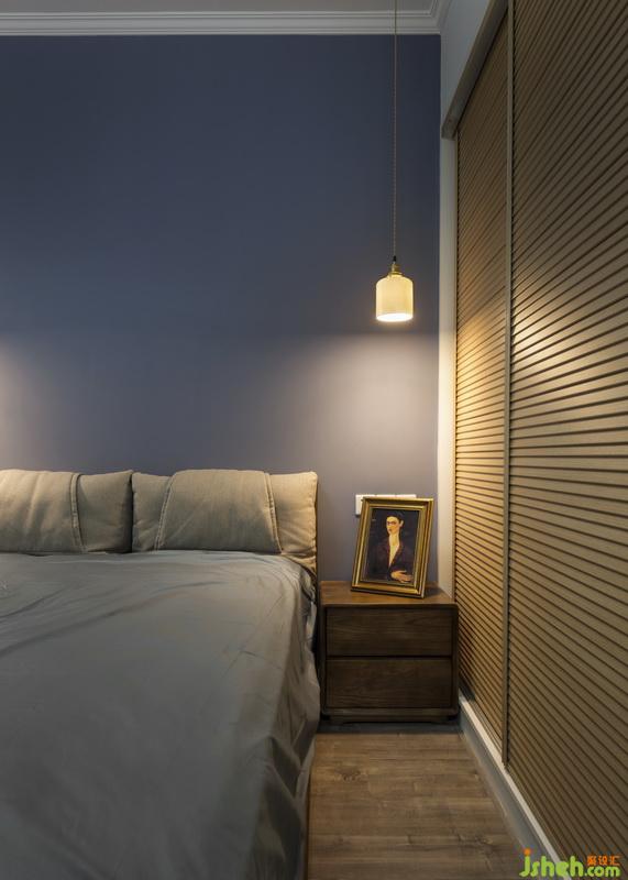 考慮到臥室這類的休息空間,更適合安靜、舒適的配色。所以床頭背景選擇了安靜的深藍(lán)色,與客廳在色彩上產(chǎn)生了關(guān)聯(lián)。