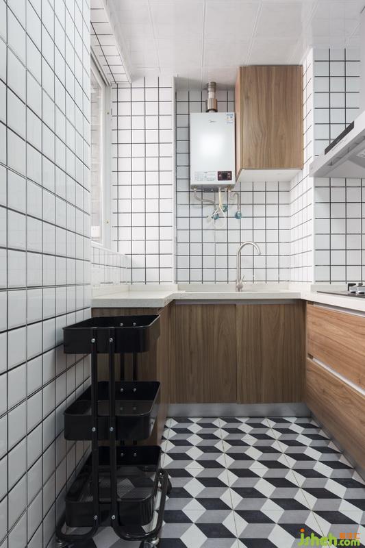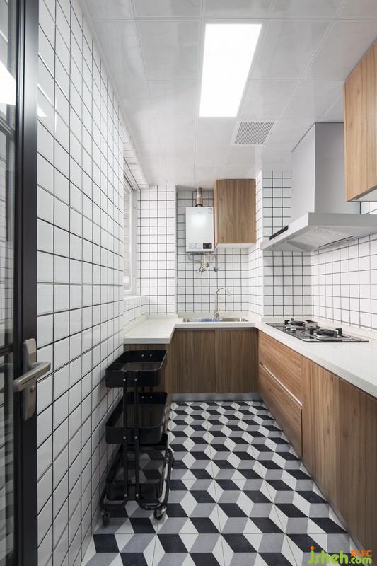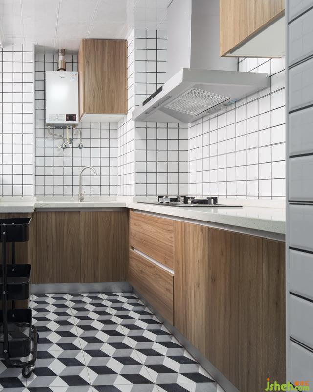 ins風(fēng)的小白磚搭配黑色的美縫,凸顯時尚簡約的線條感,視覺上無比清爽。再邂逅原木風(fēng)的櫥柜與吊柜,讓人覓得一份自然的歸屬,小U字型的操作臺面和分布合理的灶臺、水槽,讓廚房使用起來賞心悅目、極其順手。