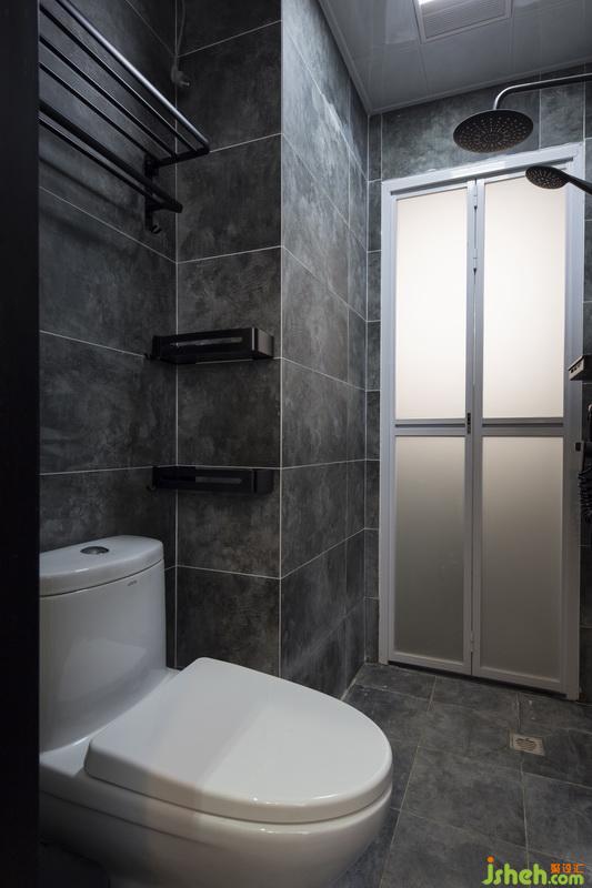 推開衛(wèi)生間的門,是干凈利落的煙灰色瓷磚,墻面和地面色彩統(tǒng)一,搭配黑色的毛巾架、懸空儲物格,輕輕松松就打造出簡約經(jīng)典的洗浴空間。