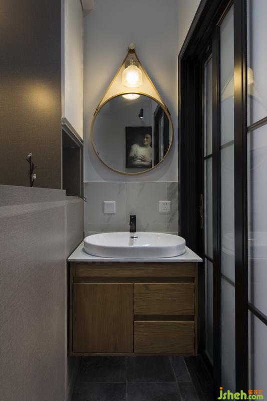 設(shè)計(jì)公司將洗手臺設(shè)置在衛(wèi)生間外面,做到了干濕分離。原木色的儲物柜在色彩上與廚房相呼應(yīng),懸空的設(shè)計(jì)更易于清潔打掃。如月亮一般的圓形鏡子,賦予空間趣味性。一幅油畫恰到好處地映入鏡中,有種復(fù)古迷離的夢境之美。