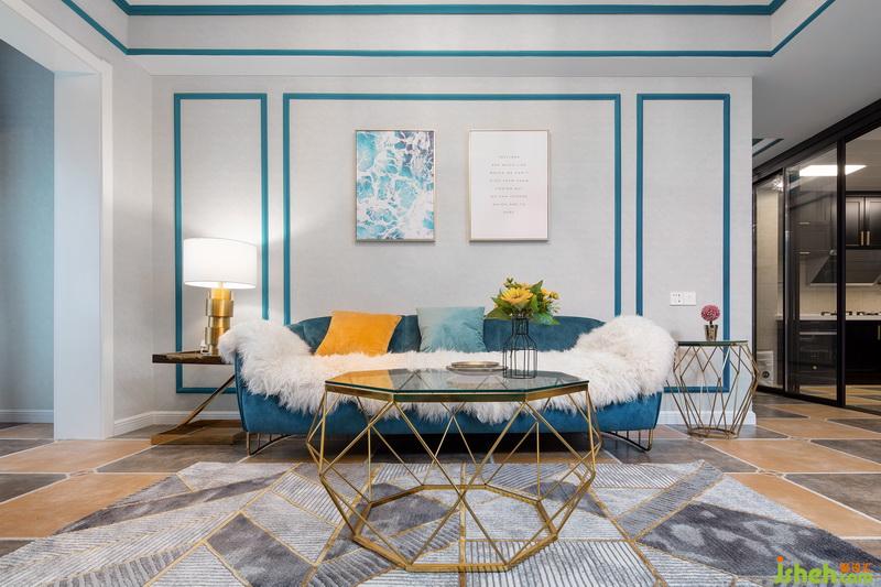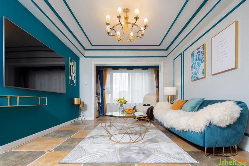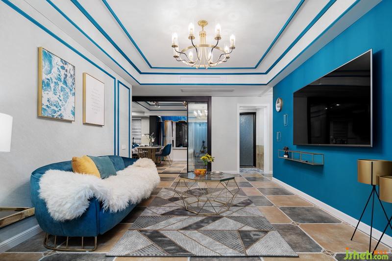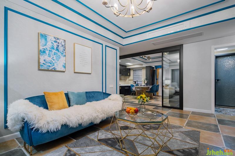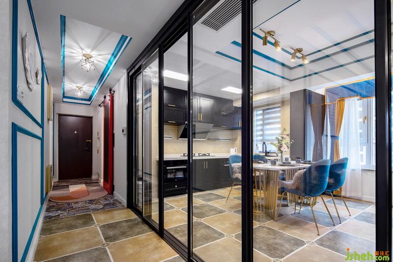 一進(jìn)門,這套作品就已經(jīng)很驚艷惹!藍(lán)色的線條配上燦爛的燈光,流光溢彩間給人一種美的享受,原本過于狹窄的過道,成了藝術(shù)走廊。地面用不同的花磚劃分出區(qū)域,墻面的藍(lán)色線條一直延伸到客廳,將各個獨(dú)立的空間連貫起來。