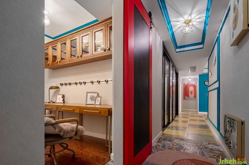一旁的紅+黑配色的谷倉門,更是讓人一眼就愛上,它與過道盡頭的魔幻裝飾畫遙相呼應(yīng)!門后還暗藏玄機(jī),藏有一個書房!