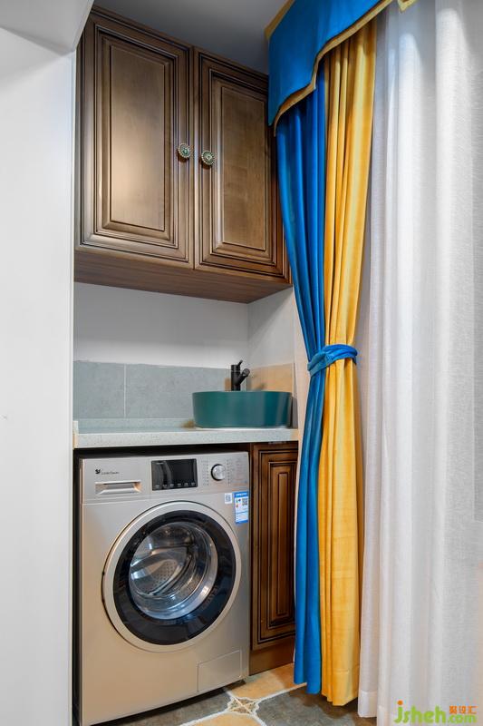 與客廳相連的陽臺,可以說是一個非常有心意的設(shè)計了!除了洗衣機(jī),還設(shè)置了單獨(dú)的洗手盆,可以洗滌小件衣物。頭頂?shù)牡豕?,輕松搞定陽臺收納!