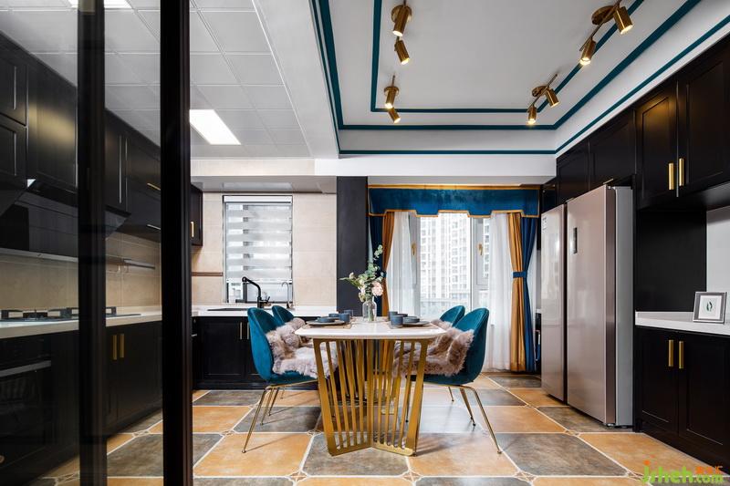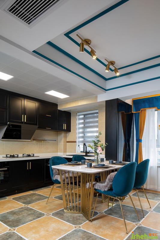 室內(nèi)設(shè)計(jì)師在餐廚區(qū)與客廳之間則使用玻璃梭門隔斷,完美隔絕油煙,也讓空間更加通透。既然采光這么好,用啞光黑色櫥柜也不怕啦,配上金色的拉手,真是高級(jí)又有質(zhì)感!