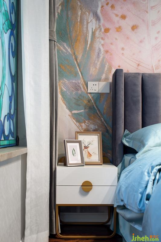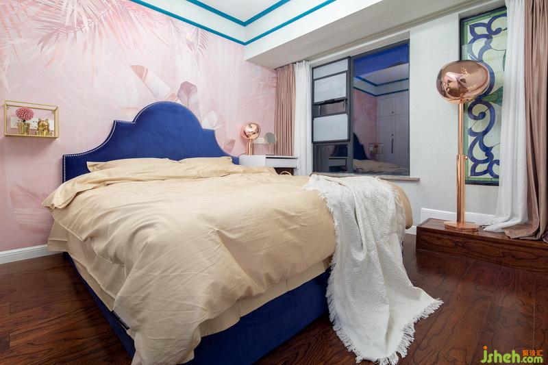 臥室是女屋主非常喜歡的樣子,大膽而溫馨的粉色墻布,上面還有隱約的植物印花。搭配寶藍(lán)色的歐式雙人床,有一種住在古堡的感覺(jué)。