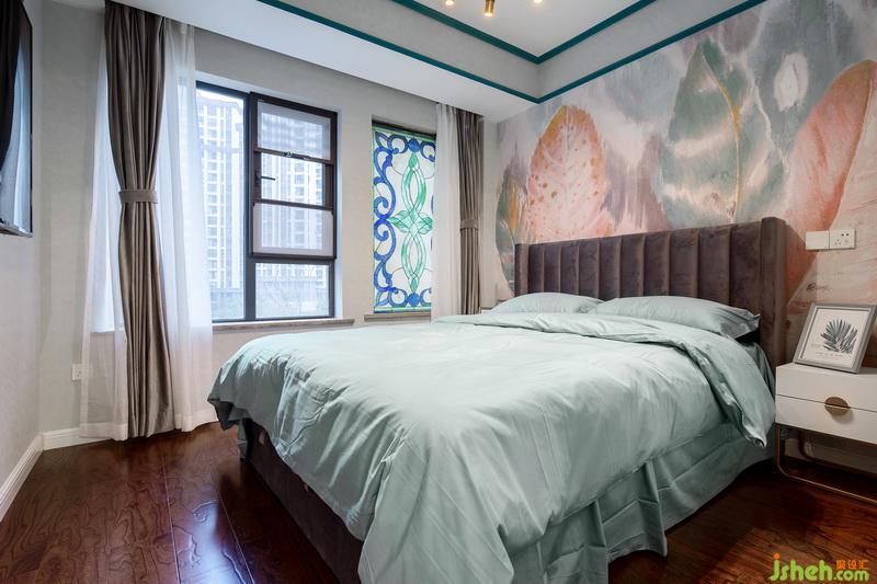 細(xì)看,木地板上還帶有復(fù)古花紋,又像是樹木把心事藏在其中,充滿了讓人品讀的韻味。局部窗戶采用了藝術(shù)玻璃,如此種種,讓臥室一方天地別有一番風(fēng)味。