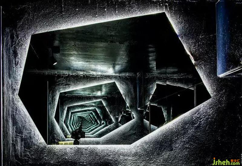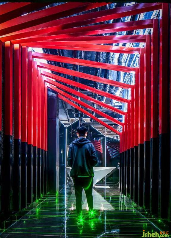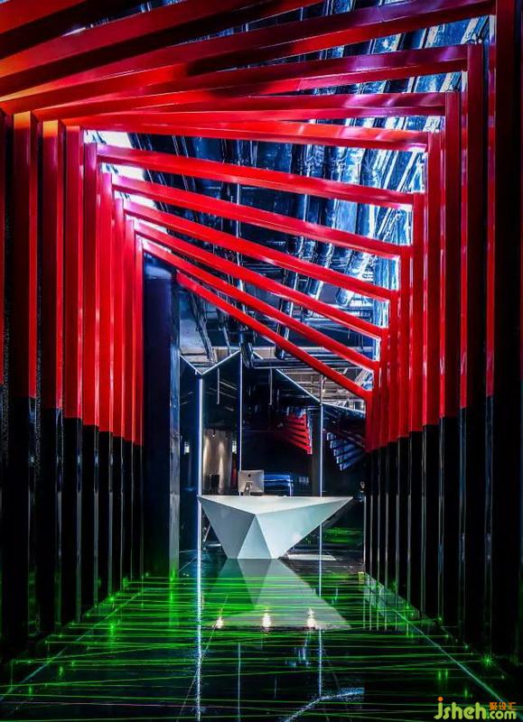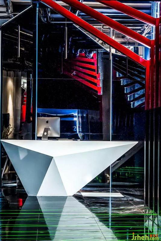 一開始進門引入眼簾的就是紅黑結(jié)構(gòu)的鋼架,地面上綠色的激光線,營造出神秘的未來視覺感,白色的不規(guī)則造型前臺作為整個空間的提亮。